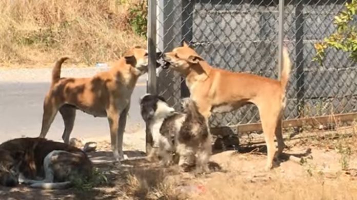 Δύο σκύλοι γαβγίζουν ο ένας στον άλλο πίσω από ένα μικρό κομμάτι συρματόπλεγμα σε μια ανοικτή αυλόπορτα…