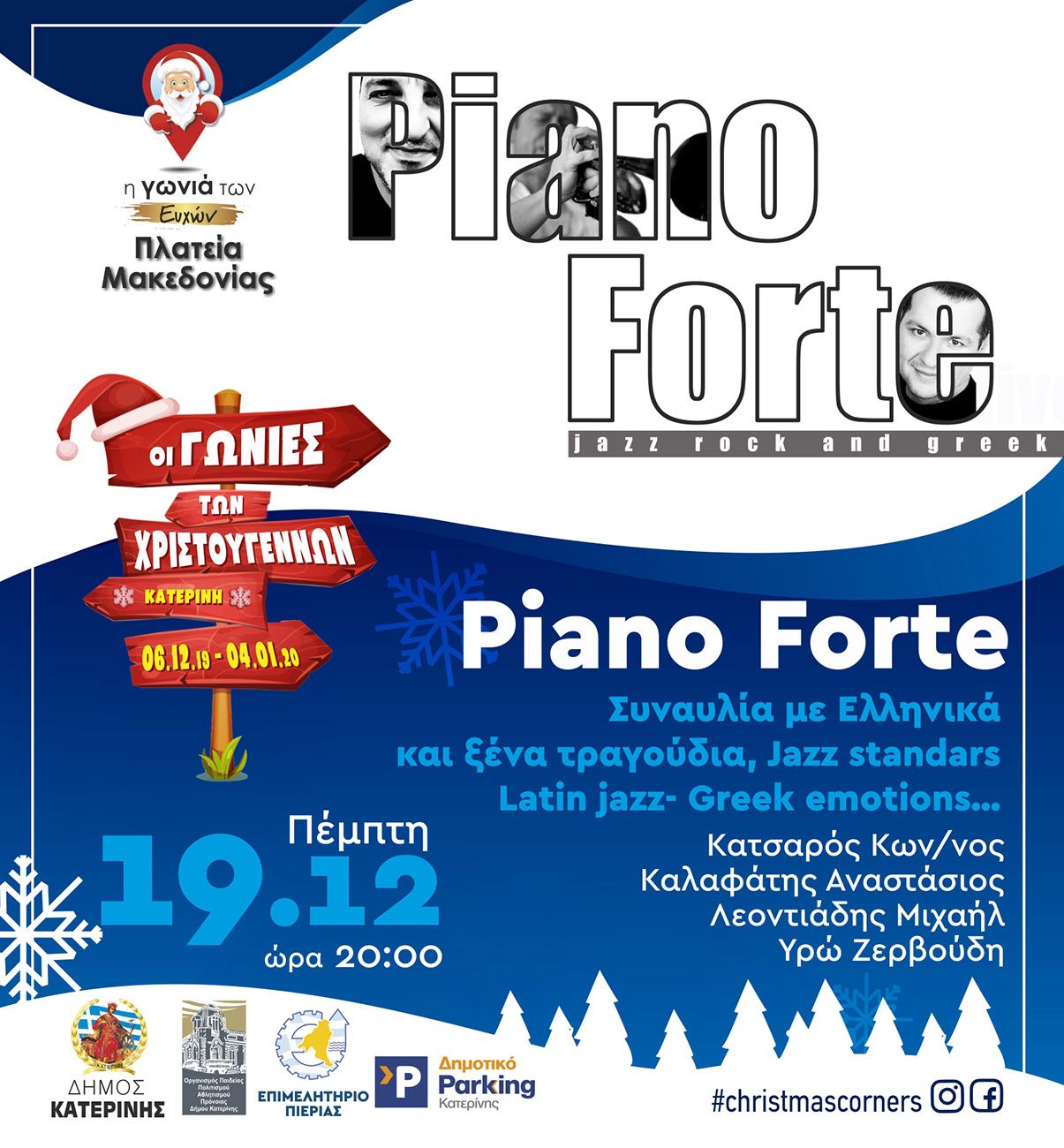 Αγαπημένες μουσικές από την Ελλάδα και όλο τον κόσμο… μεταφέρει στη «Γωνιά των Ευχών» (Πλατεία Μακεδονίας), το καταξιωμένο μουσικό σχήμα Piano Forte (Κατσαρός Κων/νος, Καλαφάτης Αναστάσιος, Λεοντιάδης Μιχαήλ, Υρώ Ζερβούδη), αύριο Πέμπτη 19 Δεκεμβρίου & ώρα 20:00. Ένα δυνατό live με πανέμορφες μελωδίες …… Ελληνικά και ξένα τραγούδια Jazz standars– Latin jazz– Greek emotions…
