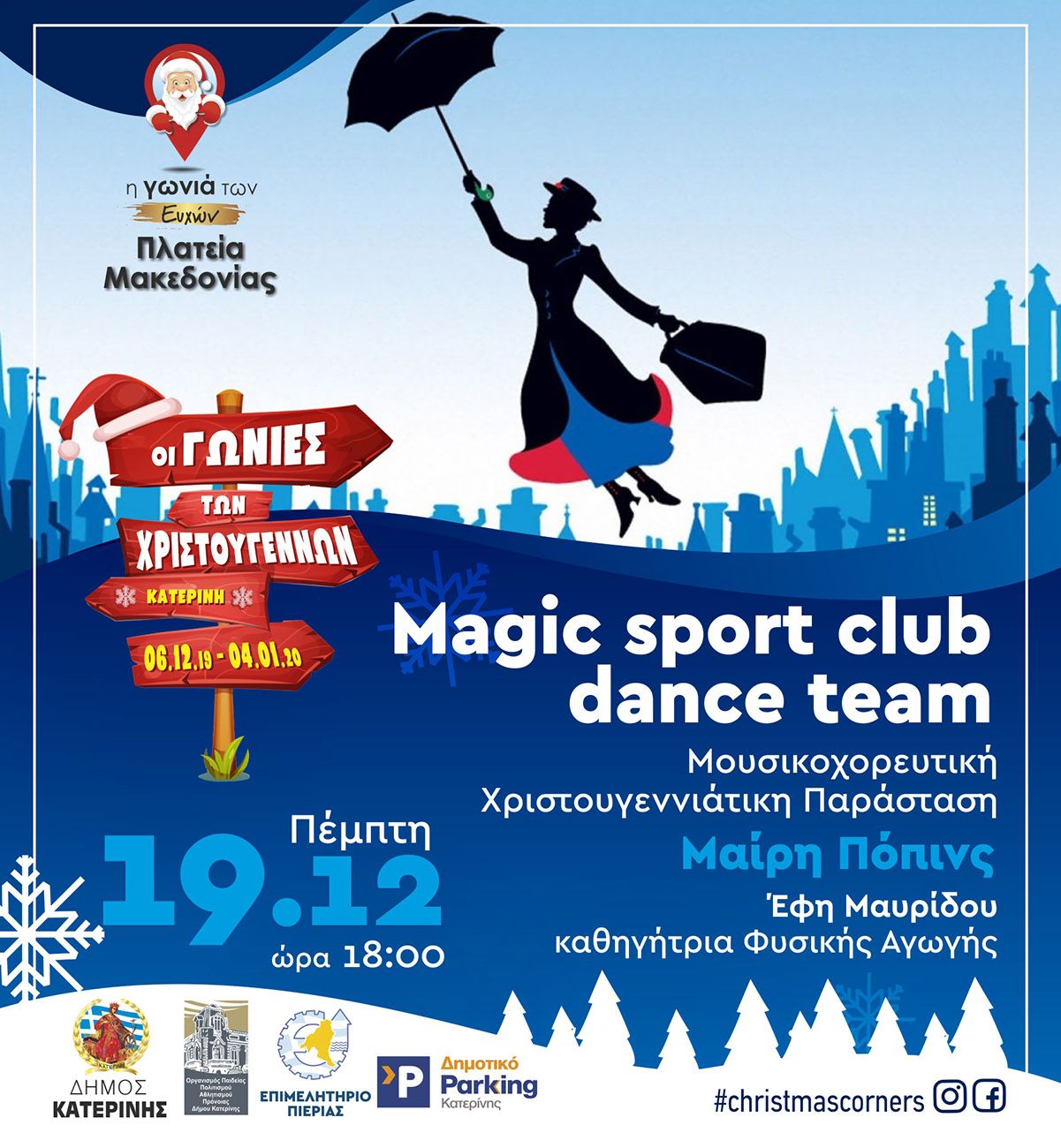 Magic sport club dance team. Παράσταση χορού για μικρούς και μεγάλους. Με μία ☂️ ομπρέλα στο χέρι, ένα καπέλο με λουλούδια, τη φούστα ως τους αστραγάλους… αυτή είναι η Μαίρη Πόπινς! Υπεύθυνη της μουσικοχορευτικής χριστουγεννιάτικης παράστασης είναι η κυρία Έφη Μαυρίδου καθηγήτρια Φυσικής Αγωγής.