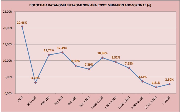 Η μεγαλύτερη αύξηση σημειώθηκε στη “ζώνη” των μισθωτών που αμείβονται κάθε μήνα με 701 ευρώ -800 ευρώ (47%).