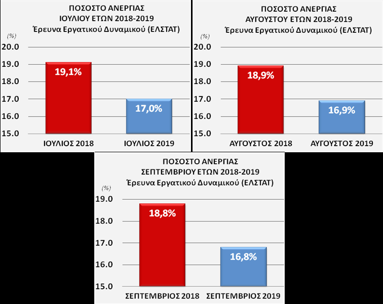 Συγκεκριμένα από τον Ιούλιο 2019 και για τρίτο συνεχόμενο μήνα τα στοιχεία της Ελληνικής Στατιστικής Αρχής (ΕΛΣΤΑΤ) συνεχίζουν να είναι θετικά. Για το μήνα Σεπτέμβριο 2019, το γενικό ποσοστό ανεργίας παρουσίασε περαιτέρω μείωση και ανήλθε στο 16,8% έναντι 18,8% τον αντίστοιχο μήνα του 2018.