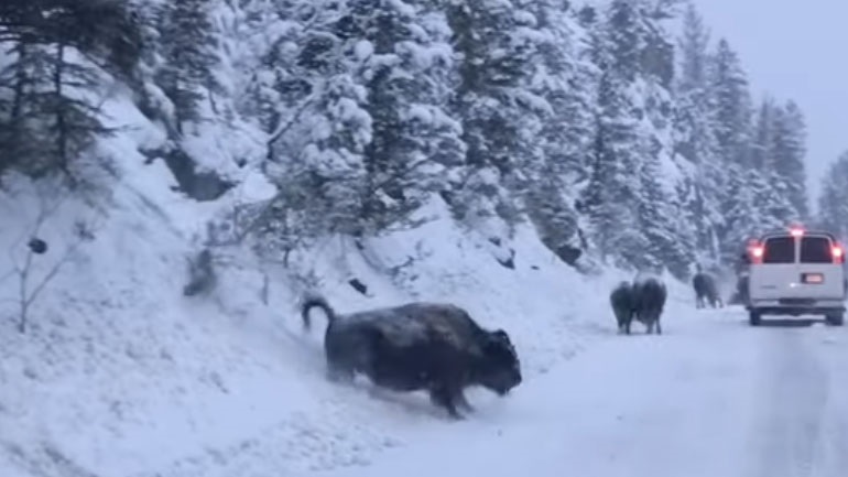 Επισκέπτης του εθνικού πάρκου Γελοουστόουν στις ΗΠΑ απαθανάτισε τη στιγμή που ένας βίσονας έκανε… τσουλήθρα στο χιόνι.