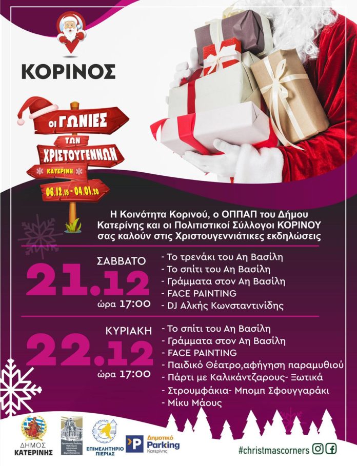 Ένα μοναδικό πρόγραμμα εορταστικών εκδηλώσεων για μικρούς και μεγάλους,παράλληλα με τις «Γωνιές των Χριστουγέννων», εναρμονισμένο με το πνεύμα των ημερών διοργανώνει ο Δήμος Κατερίνης, το Σάββατο 21 & την Κυριακή 22 Δεκεμβρίου, στη Δημοτική Κοινότητα Κορινού.