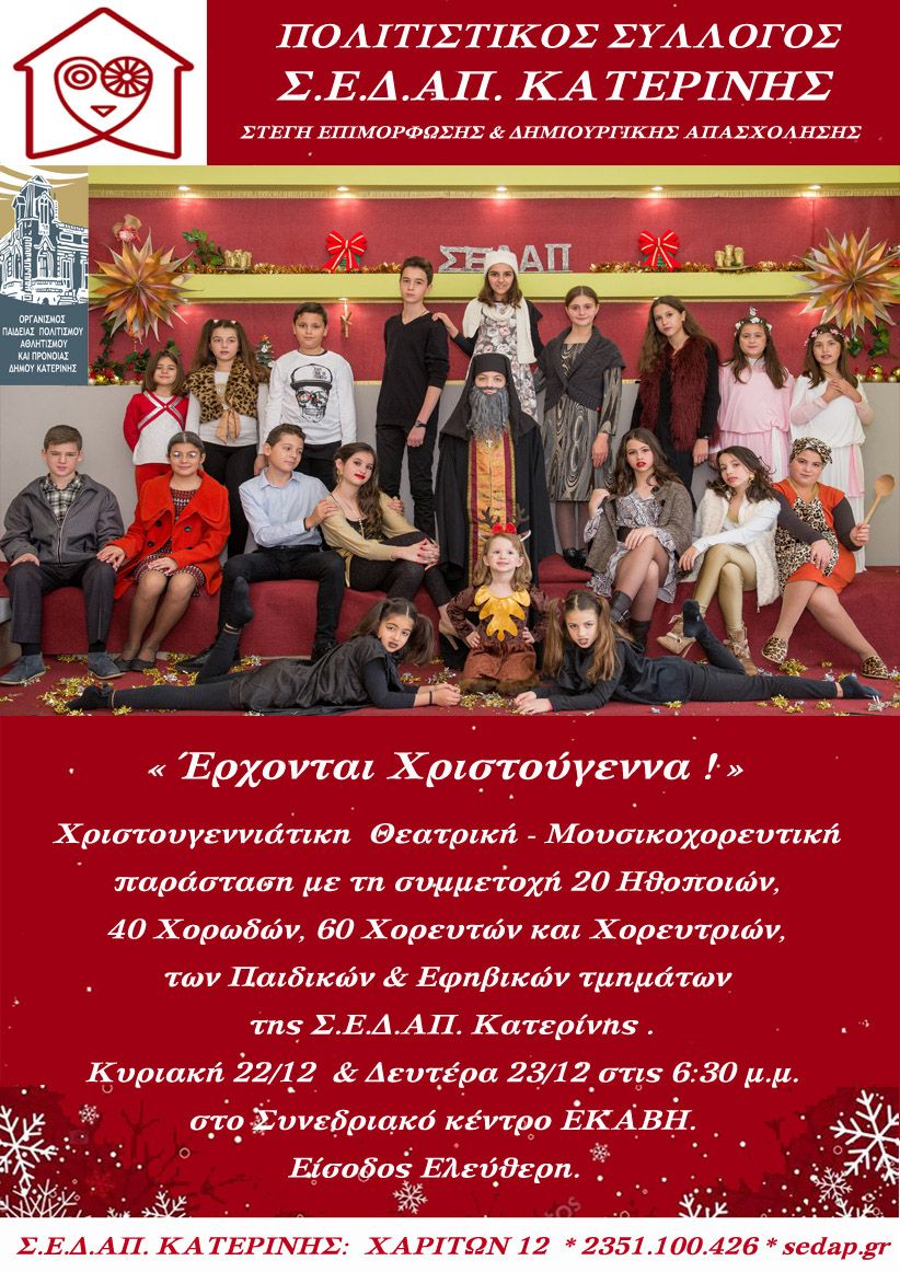 Χριστουγεννιάτικη θεατρική-μουσικοχορευτική παράσταση με τη συμμετοχή 20 ηθοποιών, 40 Χορωδών, 60 Χορευτών και Χορευτριών, των παιδικών και εφηβικών τμημάτων της ΣΕΔΑΠ Κατερίνης. Είσοδος Ελεύθερη.