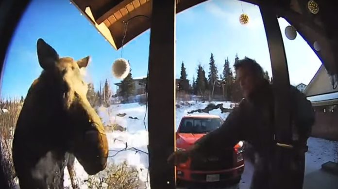 Ένας άνδρας στην Αλάσκα των ΗΠΑ που βγήκε να ελέγξει τη βεράντα του συνάντησε μια άλκη που είχε μπλεχτεί στους χριστουγεννιάτικους στολισμούς του σπιτιού.