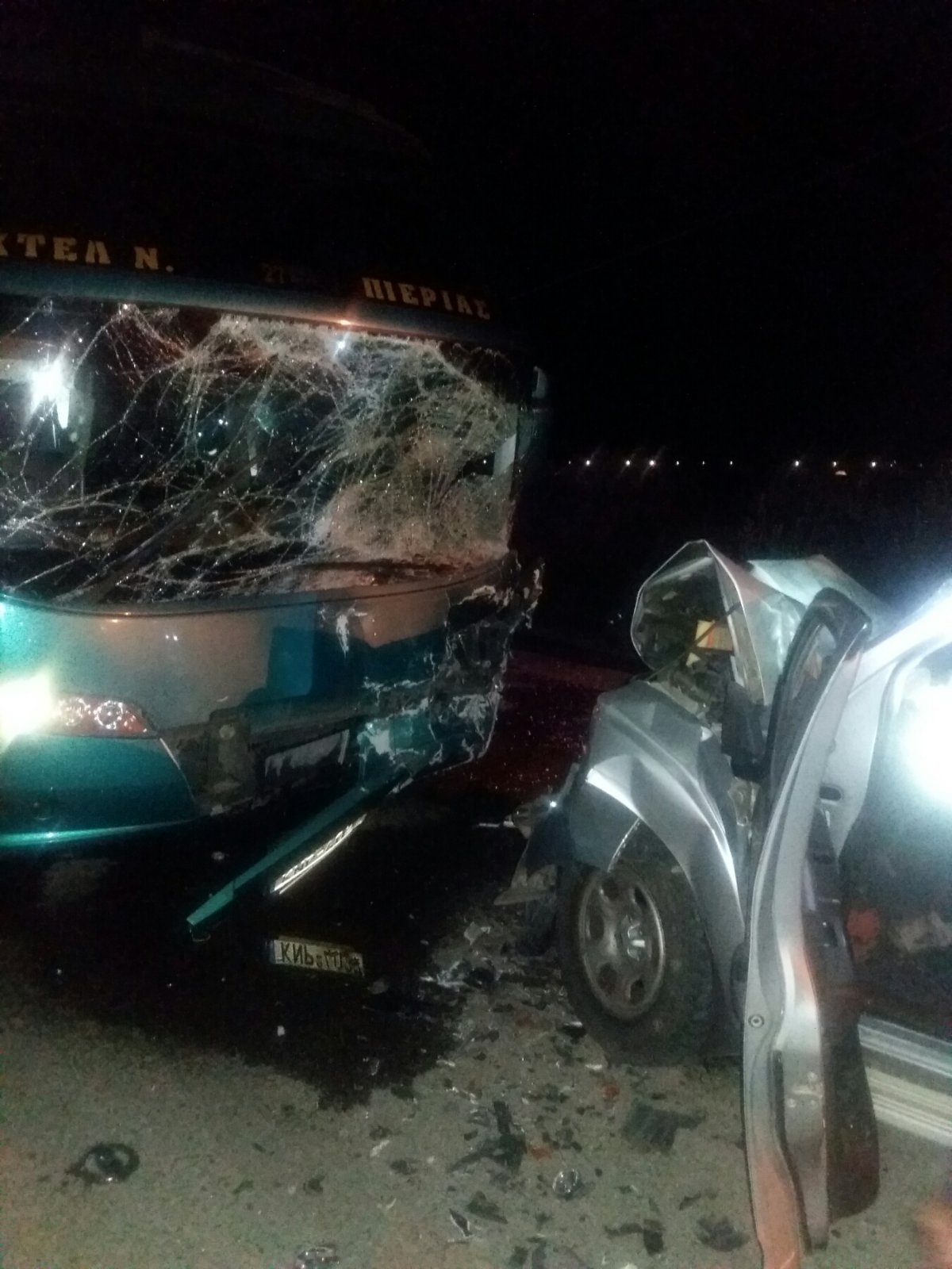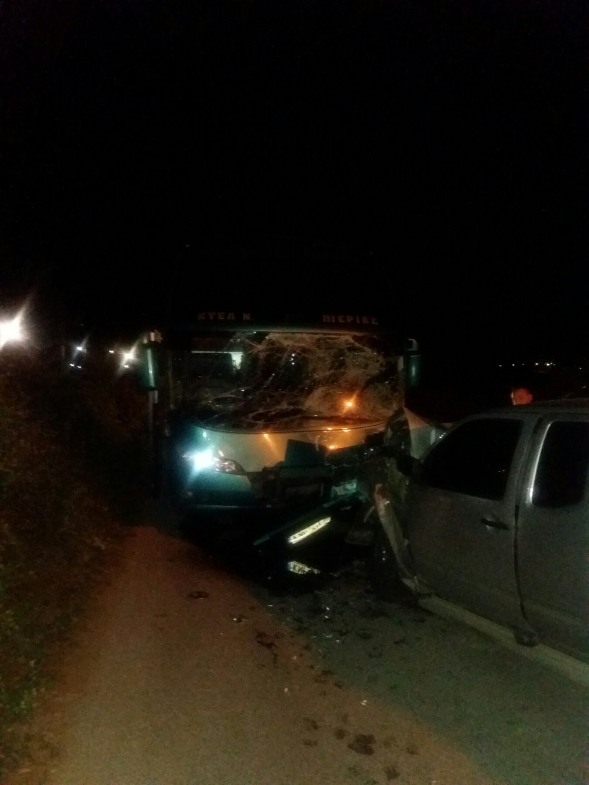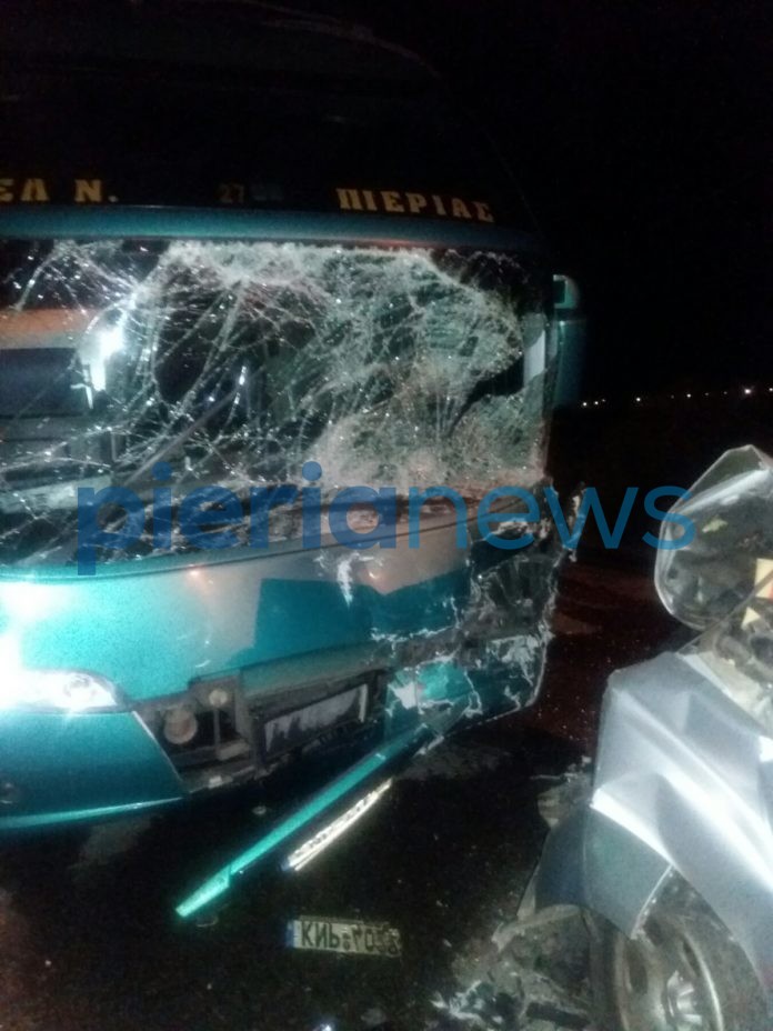 Χθές το βράδυ παραμονή των Χριστουγέννων λίγο πριν τις 22.00, στην Επαρχιακή οδό Κορινού – Κατερίνης, αγροτικό φορτηγάκι το οποίο οδηγούσε 36χρονος συγκρούστηκε μετωπικά με λεωφορείο του ΚΤΕΛ Πιερίας, το οποίο οδηγούσε 44χρονος και μαζί του επέβαιναν δύο επιβάτες., στον Κορινό Πιερίας.