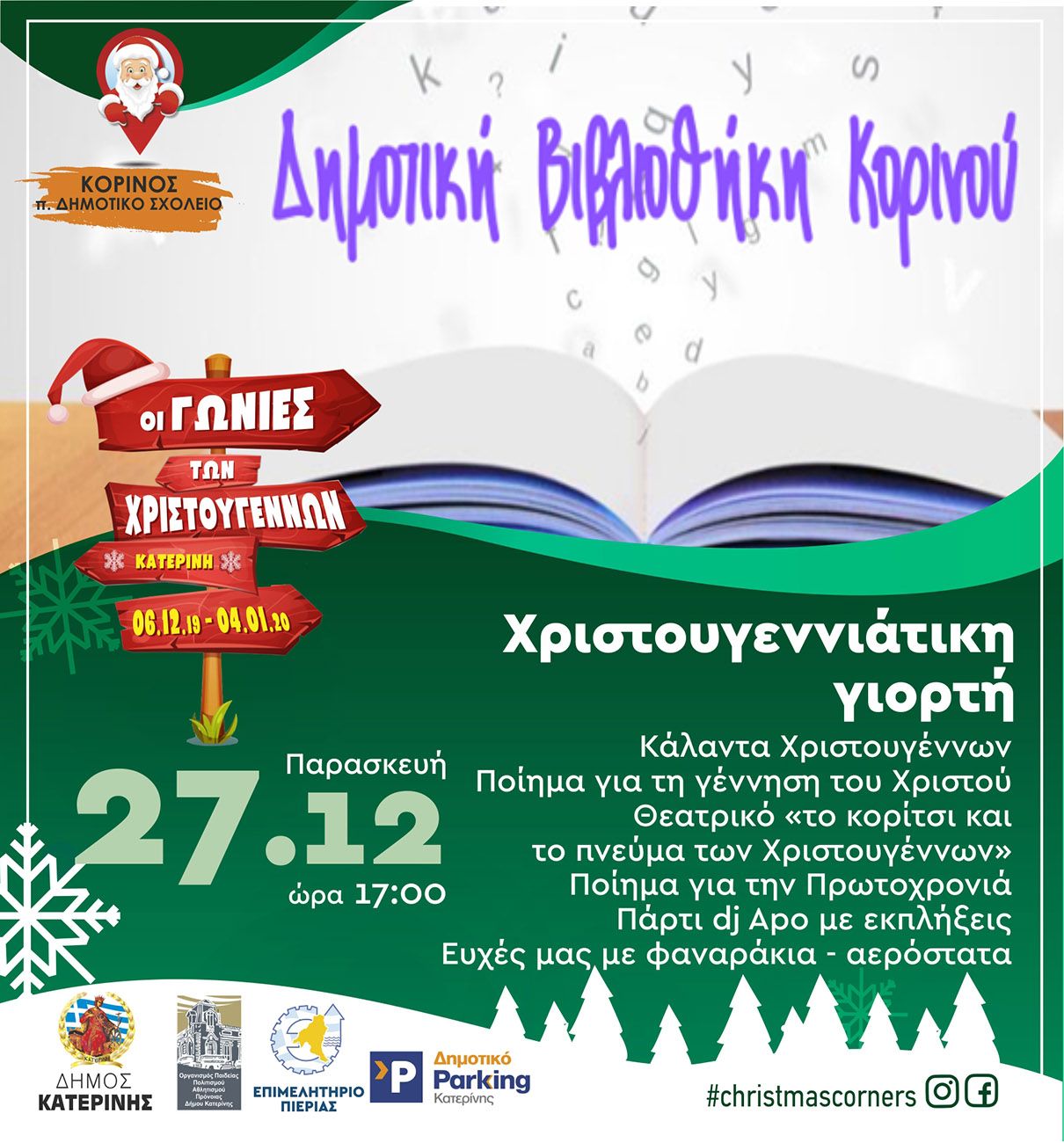 Ο Δήμος Κατερίνης προσκαλεί όλους σήμερα 27.12 και ώρα 17:00 στην Δημοτική Βιβλιοθήκη Κορινού για μια ζεστή Χριστουγεννιάτικη Γιορτή με πολλές εκπλήξεις.