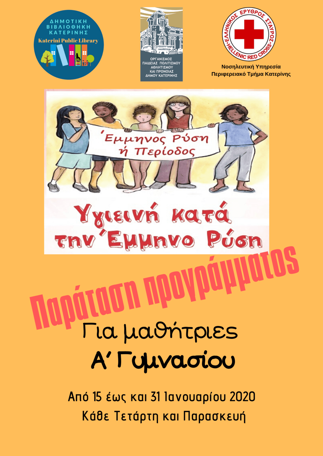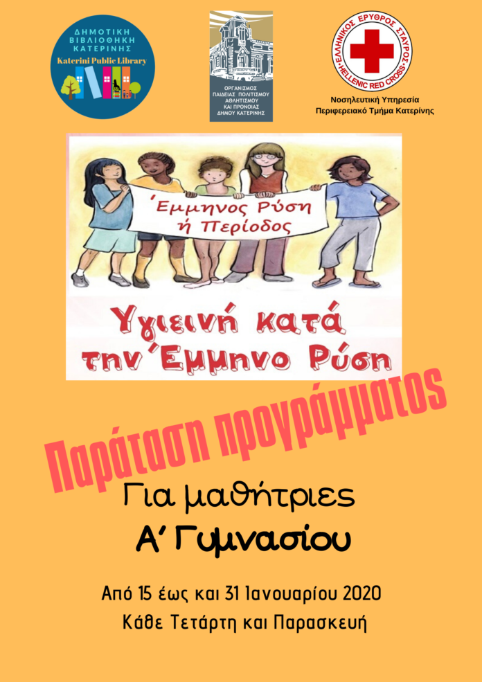 Παρατείνεται το εκπαιδευτικό πρόγραμμα αγωγής της υγείας, με τίτλο «Υγιεινή κατά την Έμμηνο Ρύση» που υλοποιείται από τη Δημοτική Βιβλιοθήκη Κατερίνης, σε συνεργασία με τη Νοσηλευτική Υπηρεσία του Ελληνικού Ερυθρού Σταυρού και τον Οργανισμό Παιδείας, Πολιτισμού, Αθλητισμού και Πρόνοιας του Δήμου Κατερίνης. Το πρόγραμμα απευθύνεται αποκλειστικά σε μαθήτριες Α’ τάξης Γυμνασίου, ενώ επικεντρώνεται στην ενημέρωση για την ατομική υγιεινή κατά τη διάρκεια της εμμήνου ρύσεως.