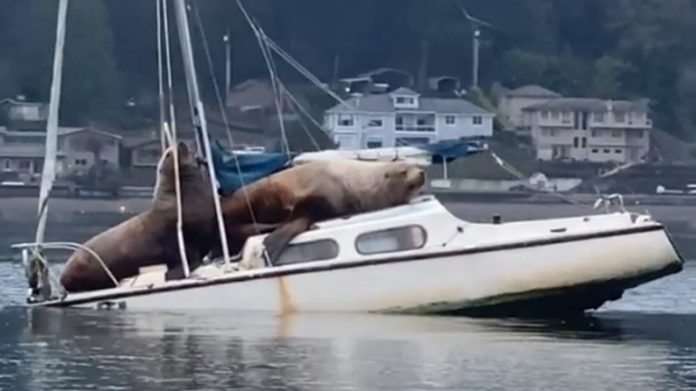 Στην πόλη Ολύμπια της Ουάσινγκτον, δύο θαλάσσια λιοντάρια απολαμβάνουν την βόλτα πάνω σε ένα ιστιοπλοϊκό σκάφος το οποίο πάσχιζε να μείνει στην επιφάνεια από το βάρος τους.