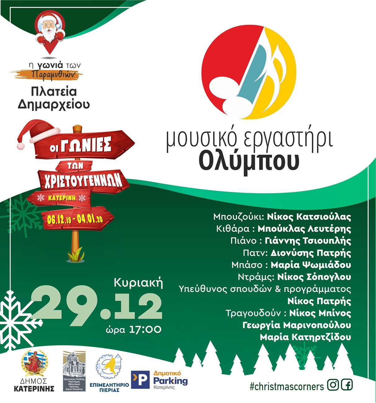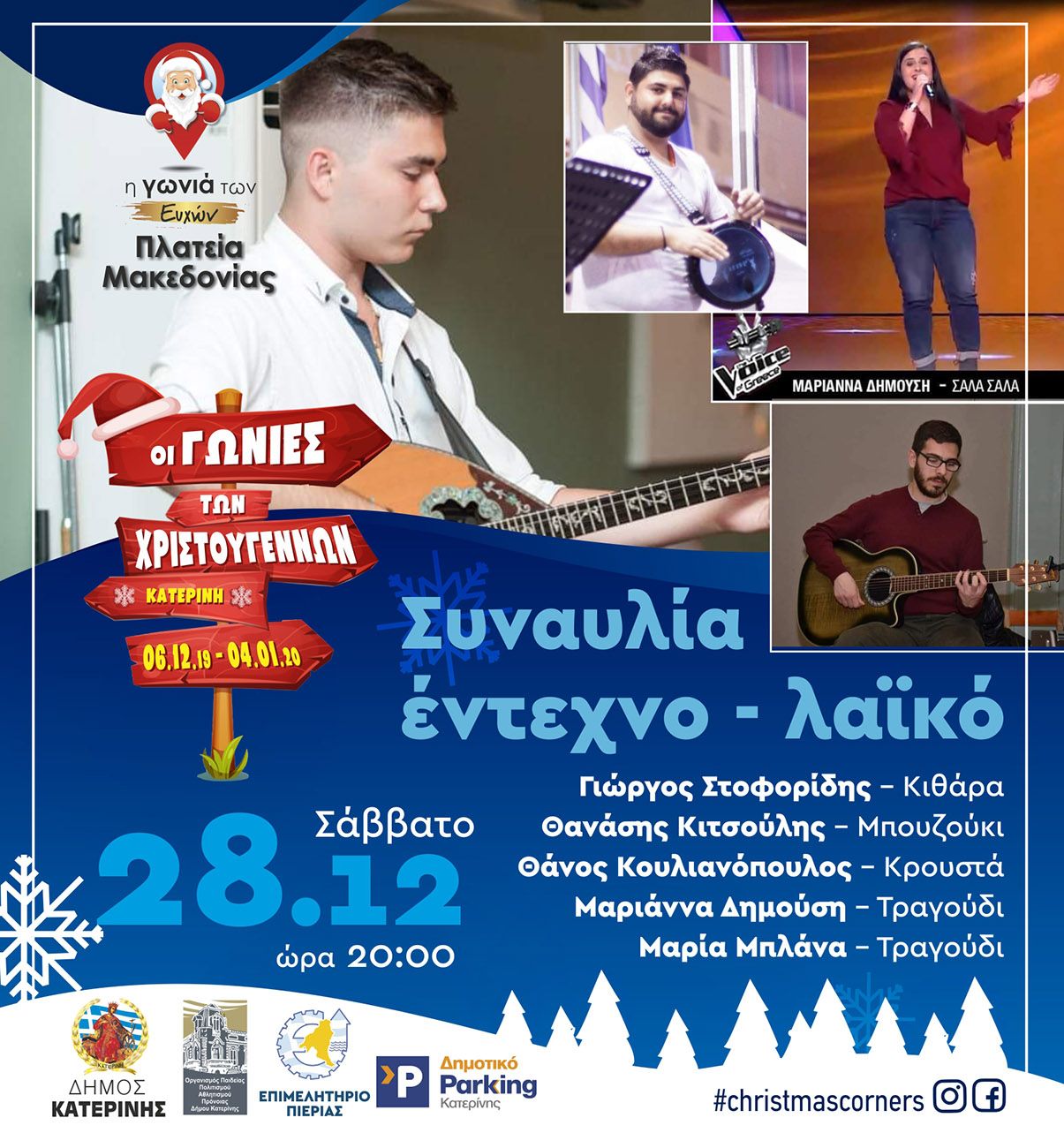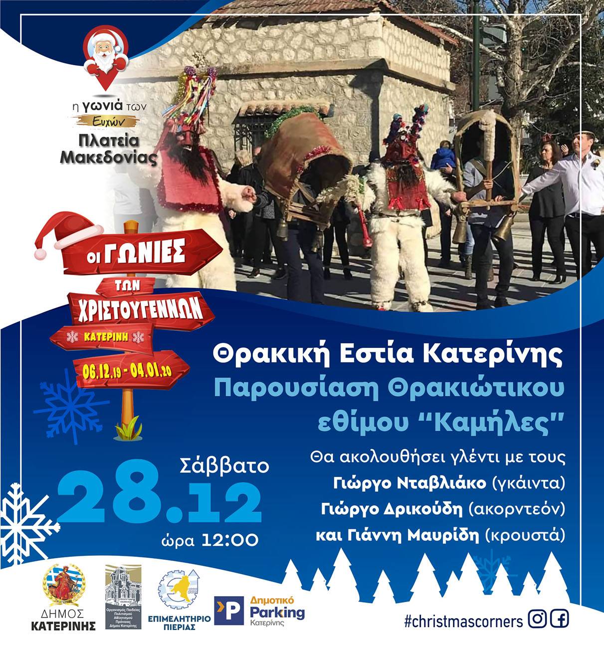 Έθιμα, μουσικές, λαϊκά γλέντια, θέατρο, παιχνίδια και αφηγήσεις συνθέτουν το ιδιαίτερα πλούσιο και για όλες τις ηλικίες πρόγραμμα εκδηλώσεων του Δήμου Κατερίνης στις «Γωνιές των Χριστουγέννων», σήμερα Σάββατο 28 και αύριο Κυριακή 29 Δεκεμβρίου αντίστοιχα. Η μαραθώνια γιορτή συνεχίζεται!