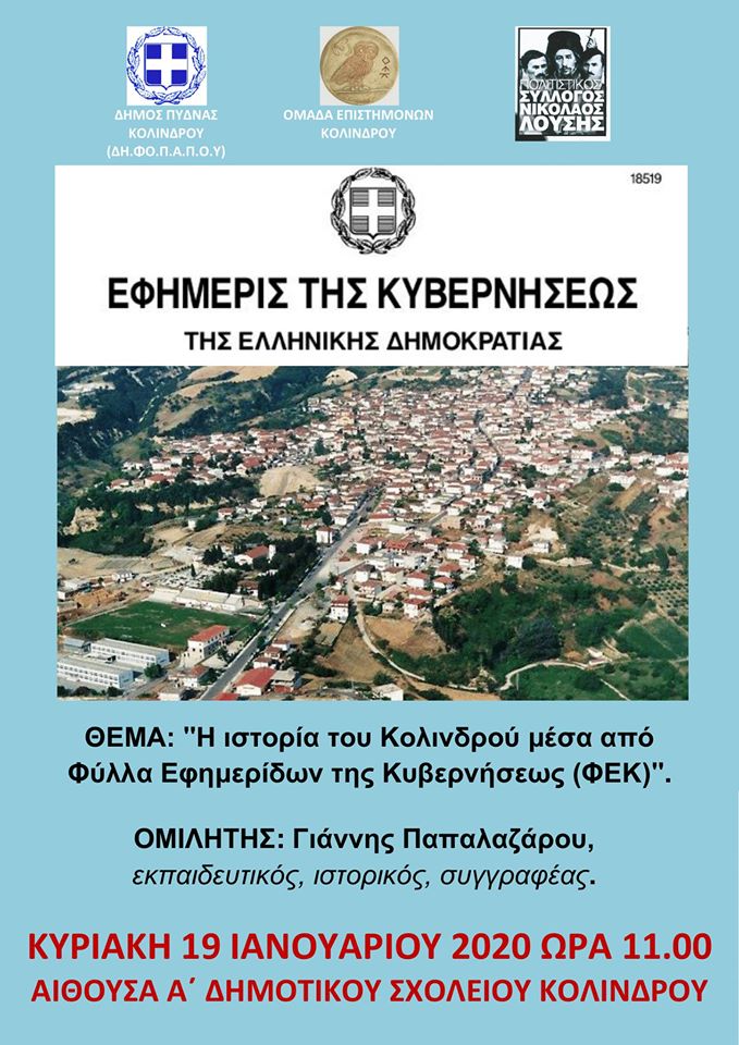 Πρόσκληση σε εκδήλωση/ομιλία με θέμα:”Η Ιστορία του Κολινδρού μέσα από τα Φύλλα Εφημερίδων της Κυβέρνησης” Κολινδρός 19 Ιανουαρίου 2020 & ώρα 11:00π.μ.