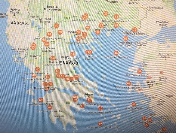 Και αμέσως εμφανίζεται ο χάρτης της Ελλάδας  με τα σημεία όπου βρίσκονται οι 70 πηγές.