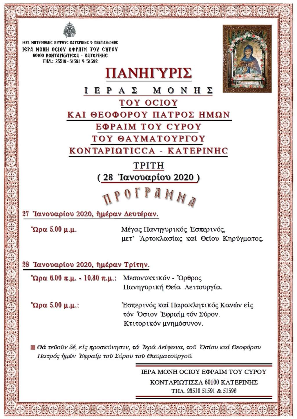 Στις 27 και 28 Ιανουαρίου πανηγυρίζει η Ιερά Μονή Οσίου Εφραίμ του Σύρου Κονταριώτισσας Κατερίνης, τιμώντας τον προστάτη της Οσιο Εφραίμ