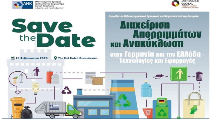 Στο μεταξύ, στο πλαίσιο της προγραμματισμένης επίσκεψης των γερμανικών επιχειρήσεων, θα πραγματοποιηθεί Ημερίδα με θέμα “Διαχείριση Απορριμμάτων και Ανακύκλωση στη Γερμανία και την Ελλάδα – Τεχνολογίες και Εφαρμογές”, που θα λάβει χώρα την Τρίτη 18 Φεβρουαρίου 2020, στο THE MET HOTEL, όπου οι γερμανικές εταιρείες θα παρουσιάσουν τα προϊόντα και τις υπηρεσίες τους, ενώ εξειδικευμένοι Έλληνες και Γερμανοί εισηγητές θα αναλύσουν το ισχύον θεσμικό πλαίσιο, καθώς και τις δυνατότητες εφαρμογής και τις προοπτικές χρήσης των σχετικών τεχνολογιών στην Ελλάδα.