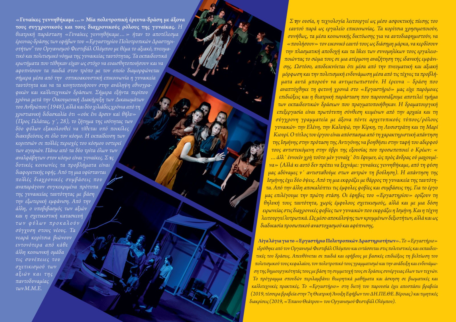Η παράσταση ήταν το αποτέλεσμα ετήσιας έρευνας-δράσης των εφήβων του «Εργαστηρίου» με θέμα το αξιακό, πνευματικό και πολιτισμικό νόημα της γυναικείας ταυτότητας. Η είσοδος στη θεατρική παράσταση είναι ελεύθερη.