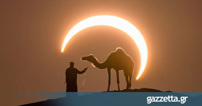 Συγκεκριμένα απαθανάτισε έναν άνθρωπο να περπατάει με μια καμήλα πάνω σε έναν αμμόλοφο, με φόντο την έκλειψη.