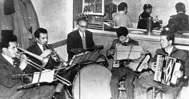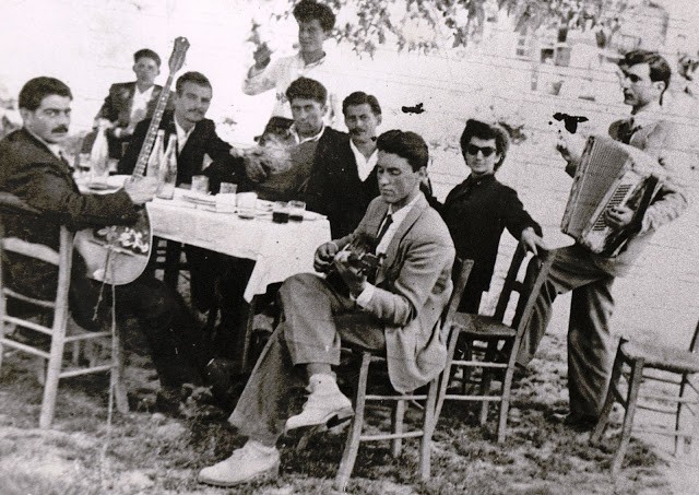 Στην αυλή του κέντρου διασέδασης “Πετρωτός” στην συνοικία του Σιδηρ. Σταθμού Κατερίνης, ο βιρτουόζος παίκτης μπουζουκιού “Τακάκης (Χωλόπουλος) με την κομπανία του.