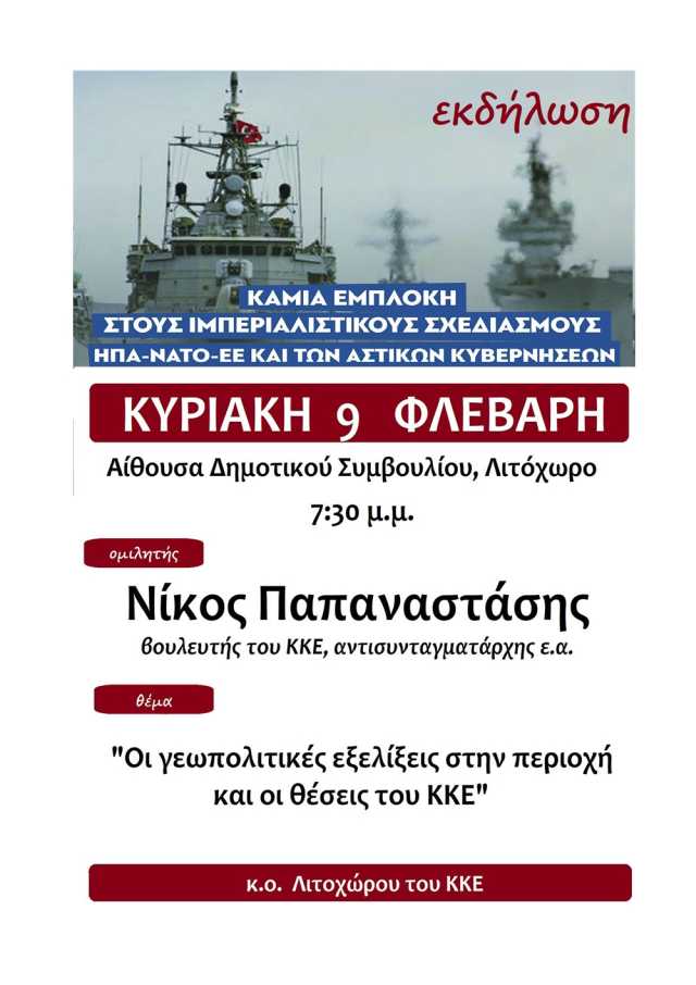 Εκδήλωση με θέμα «Οι γεωπολιτικές εξελίξεις στην περιοχή και οι θέσεις του ΚΚΕ» διοργανώνει η ΚΟ Λιτοχώρου του Κόμματος, την Κυριακή 9 Φλεβάρη, στις 6 μ.μ. στην αίθουσα του Δημοτικού Συμβουλίου στο Λιτόχωρο.