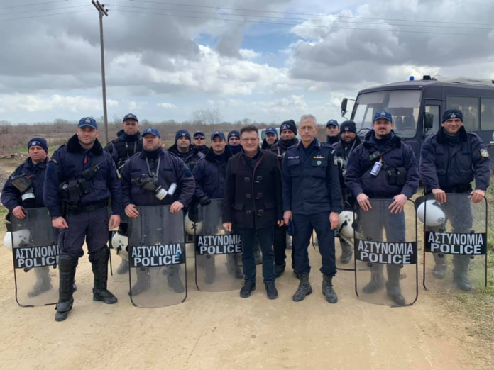 Η διμοιρία της ΕΛΑΣ από την Πιερία, που με το στρατό φυλάσσουν το Πέταλο Έβρου και τον υπουργό Προστασίας του Πολίτη Μιχάλη Χρυσοχοΐδη, που ενημερώθηκε για τις συνεχιζόμενες κοινές επιχειρήσεις αποτροπής εισόδου χιλιάδων μεταναστών στο έδαφός μας.