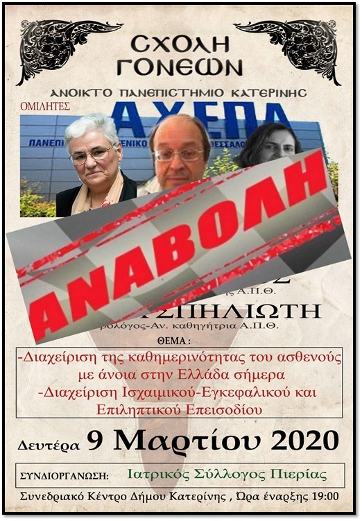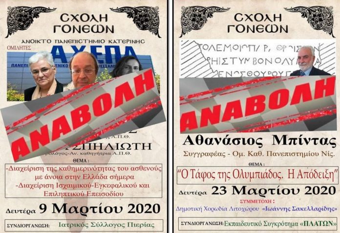 Με αφορμή το Δελτίο Τύπου του Υπουργείου Υγείας της Κυριακής 8 Μάρτιου 2020 νέων προληπτικών μέτρων για την προστασία της Δημόσιας Υγείας σύμφωνα με το οποίο αναστέλλονται οποιαδήποτε Συνεδριακή Εκδήλωση στην Επικράτεια για τις επόμενες 4 εβδομάδες με ημερομηνία έναρξης εφαρμογής του μέτρου την Δευτέρα 9 Μαρτίου 2020, οι κάτωθι 2 εκδηλώσεις της Σχολής Γονέων – Ανοικτό Πανεπιστήμιο Κατερίνης: Αναβάλλονται.