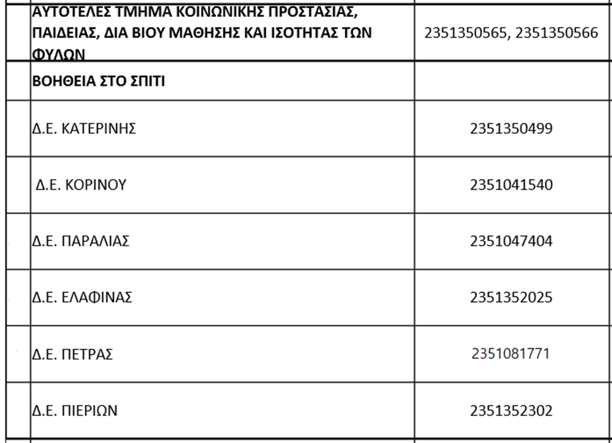 Υπενθυμίζεται, ότι, τα τηλέφωνα επικοινωνίας στις υπηρεσίες Κοινωνικής Προστασίας του Δήμου Κατερίνης είναι τα εξής:
