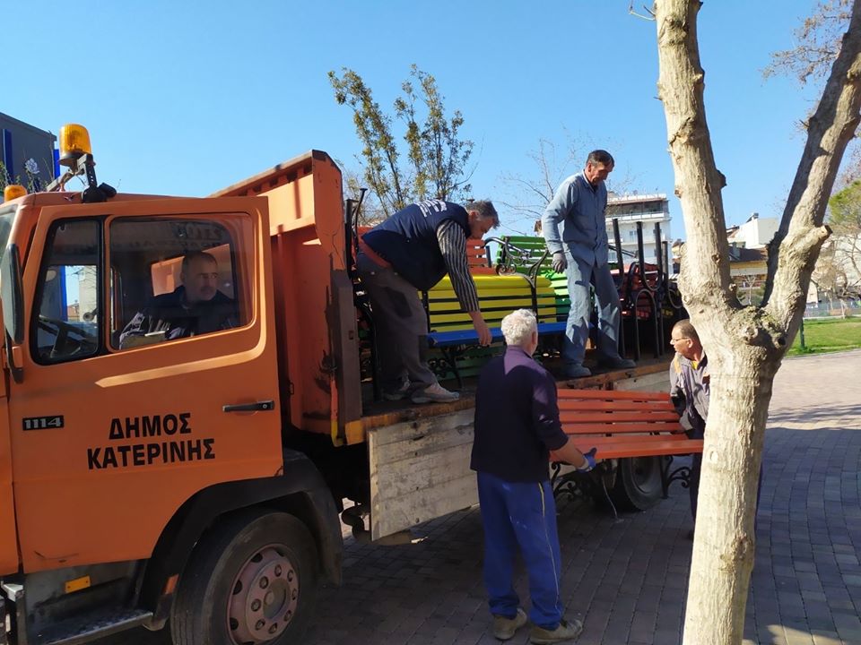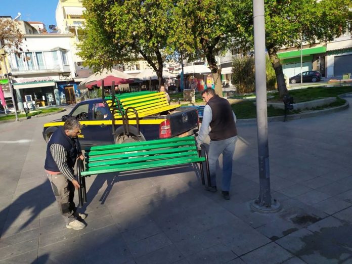 Με εντολή Δημάρχου, από το πρωί συνεργεία του Δήμου Κατερίνης απομακρύνουν όλα τα παγκάκια από τις πλατείες της πόλης.