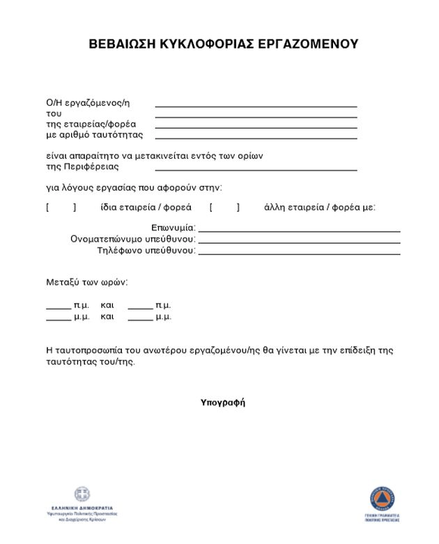 Για τους πολίτες που μετακινούνται προς και από τη δουλειά τους, θα χρειαστεί να έχουν μαζί τους ένα έντυπο βεβαίωσης κίνησης «Τύπου Α». Ενώ, για όλες τις υπόλοιπες μετακινήσεις οι πολίτες μπορούν να επιλέξουν μία από τις παρακάτω τρεις ενέργεις: