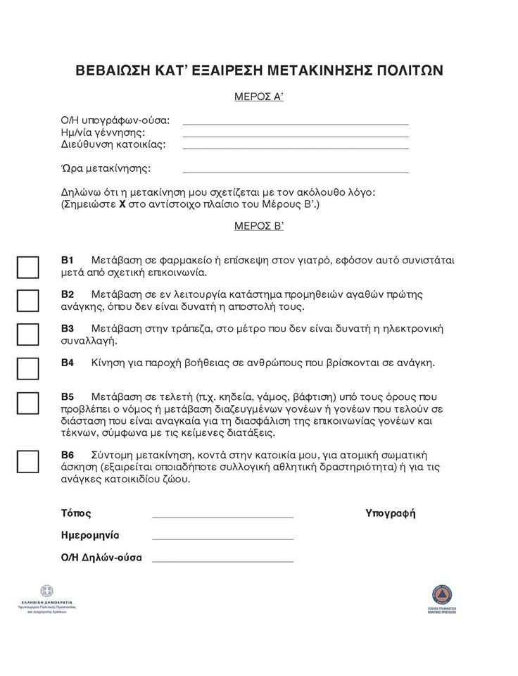 Υπενθυμίζεται ότι οι πολίτες μπορούν να μετακινηθούν με τρεις τρόπους. Αυτοί είναι είτε με την συμπλήρωση ενός εγγράφου «Τύπου Α» ή «Τύπου Β», με την αποστολή ενός SMS στο 13033, είτε με την συμπλήρωση ενός χαρτιού με το Ονοματεπώνυμό τους. Οι μετακινήσεις πολιτών, μετά την εφαρμογή της απαγόρευσης της κυκλοφορίας, θα γίνεται για την εξυπηρέτηση αναγκών τους που δεν μπορούν να ικανοποιηθούν με άλλον τρόπο επιτρέπονται μόνο για τους ακόλουθους λόγους: