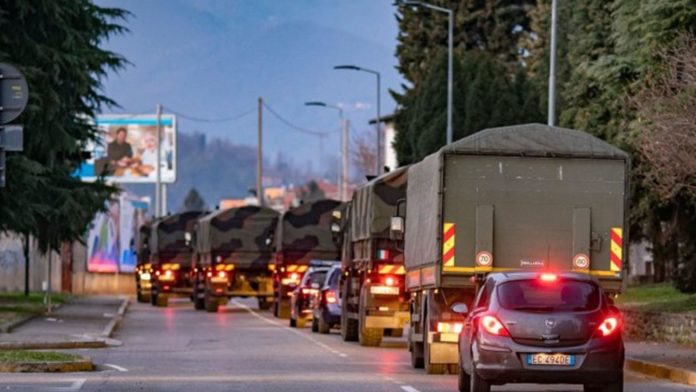 Σήμερα το πρωί, ένα κομβόι στρατιωτικών φορτηγών μετάφερε πέντε σορούς στην Τζεμόνα, στη γειτονική περιφέρεια Φριούλι Βενέτσια Τζούλια, κοντά στη Λομβαρδία, περιγράφει φωτορεπόρτερ του Γαλλικού Πρακτορείου.