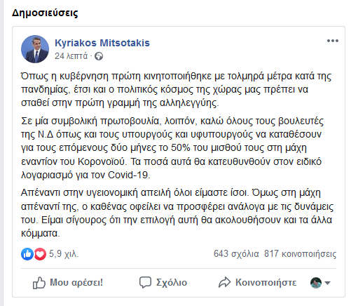 Με ανάρτησή του στο fb ο Κυριάκος Μητσοτάκης, κάνει λόγο για μια συμβολική πρωτοβουλία, σημειώνοντας πως τα χρήματα θα κατατεθούν σε ειδικό λογαριασμό για τον Covid-19. «Απέναντι στην υγειονομική απειλή είμαστε όλοι ίσοι» σημειώνει ο πρωθυπουργός, εκφράζοντας την πεποίθηση πως σ’ αυτήν την πρωτοβουλία θα ανταποκριθούν και τα άλλα κόμματα.