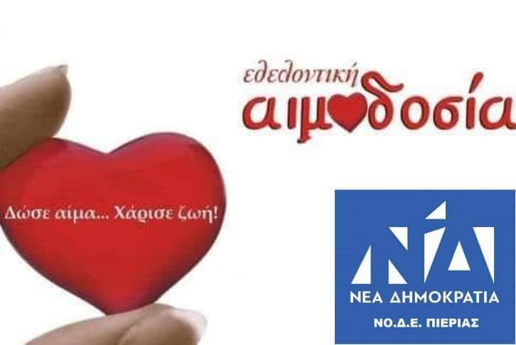 Η ΝΟΔΕ ΝΔ ΠΙΕΡΙΑΣ καλεί τα  μέλη και τους φίλους της αλλά και κάθε συμπολίτη μας να συμμετέχουν σε εθελοντική αιμοδοσία για την κάλυψη των  αναγκών αίματος στα νοσοκομεία μας