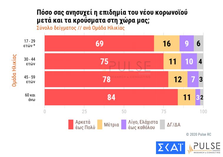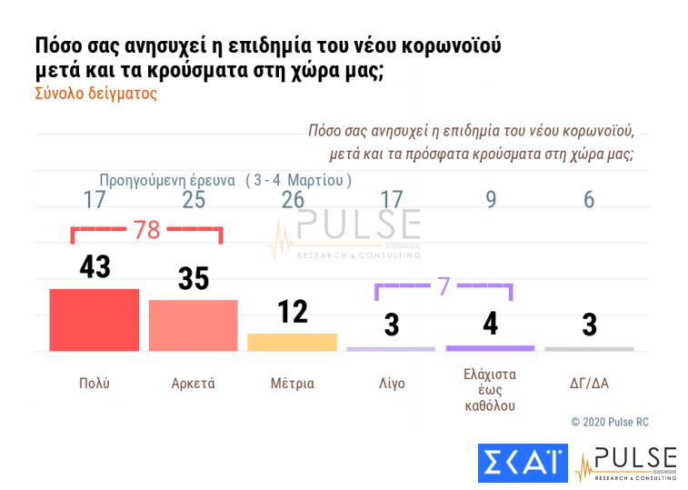 Στην έρευνα που διενεργήθηκε πανελλαδικά το διάστημα 30 Μαρτίου – 1 Απριλίου οι πολίτες δηλώνουν σε ποσοστό 78% ότι ανησυχούν πολύ και αρκετά για την πανδημία μετά τα κρούσματα στη χώρα μας.