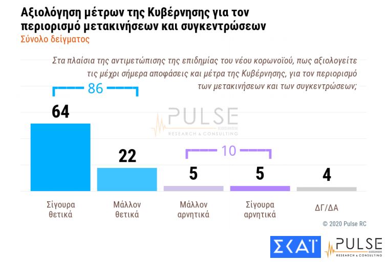 Η μεγάλη πλειοψηφία αξιολογεί θετικά τα μέτρα για τον περιορισμό των μετακινήσεων και των συγκεντρώσεων προκειμένου να περιοριστεί η εξάπλωση του κορωνοϊού. Το 86% δηλώνει ότι είναι σίγουρα και μάλλον θετικά τα μέτρα. Μόλις το 10% απαντά ότι είναι μάλλον και σίγουρα αρνητικά.