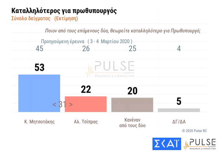 Στην καταλληλότητα για την πρωθυπουργία ο Κυριάκος Μητσοτάκης αυξάνει το ποσοστό αποδοχής στο 53% από 45% στην προηγούμενη μέτρηση. Ο πρόεδρος του ΣΥΡΙΖΑ, Αλέξης Τσίπρας έρχεται δεύτερος με ποσοστό 22% και σημειώνει πτώση 4 μονάδων από την προηγούμενη μέτρηση. Το 20% των πολιτών απαντά κανέναν από τους δύο.