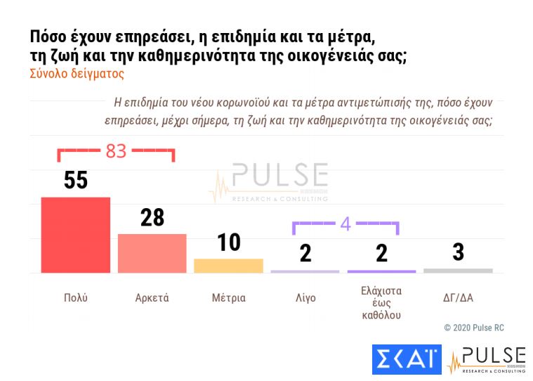Στην ερώτηση πόσο έχουν επηρεάσει την καθημερινότητα και τη ζωή της οικογένειας τους η επιδημία και τα μέτρα οι Έλληνες απαντούν σε ποσοστό 83% πολύ έως αρκετά. Μόλις το 10% δηλώνει μέτρια και το 4% λίγο και ελάχιστα έως καθόλου.