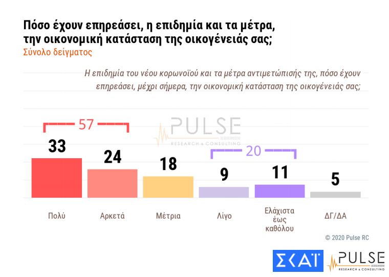 Ποσοστό 57% των πολιτών δηλώνει ότι η πανδημία και τα μέτρα αντιμετώπισης της έχει επηρεάσει πολύ και αρκετά την οικονομική κατάσταση τους. Το 20% των πολιτών δηλώνει ότι έχει επηρεαστεί λίγο και ελάχιστα έως καθόλου οικονομικά και το 18% απαντά μέτρια.
