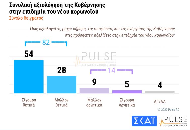 Η συντριπτική πλειοψηφία αξιολογεί πολύ θετικά τις αποφάσεις και τις ενέργειες της κυβέρνησης για την πανδημία. Το 82% κρίνει θετικά και μάλλον θετικά την κυβέρνηση και το 14% μάλλον αρνητικά και σίγουρα αρνητικά.