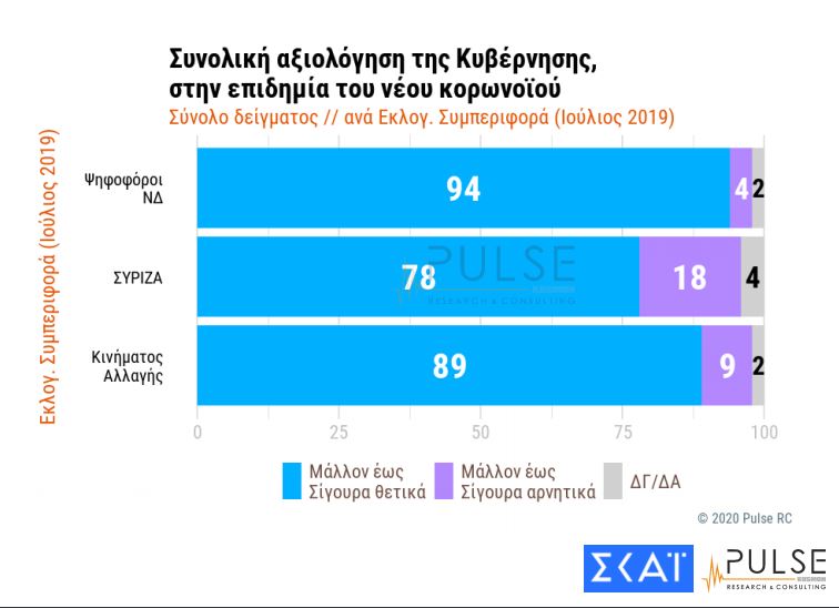 Πιο συγκεκριμένα το 94% των ψηφοφόρων της ΝΔ κρίνουν μάλλον και σίγουρα θετικά τον τρόπο αντίδρασης της κυβέρνησης. Το ίδιο απαντά το 78% των ψηφοφόρων του ΣΥΡΙΖΑ και το 89% των ψηφοφόρων του ΚΙΝΑΛ.