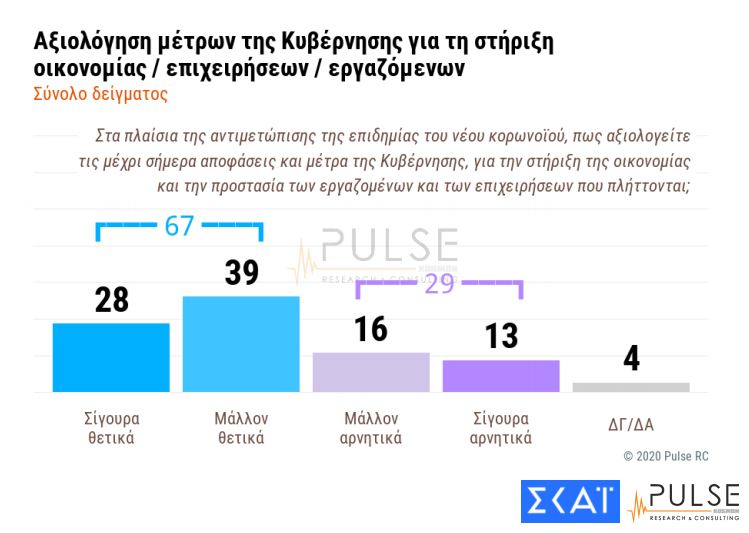 Ικανοποιημένοι εμφανίζονται οι Έλληνες για τα μέτρα στήριξης της οικονομίας, των επιχειρήσεων και των εργαζομένων. Το 67% κρίνει σίγουρα και μάλλον θετικά τα μέτρα και το 29% μάλλον και σίγουρα αρνητικά.