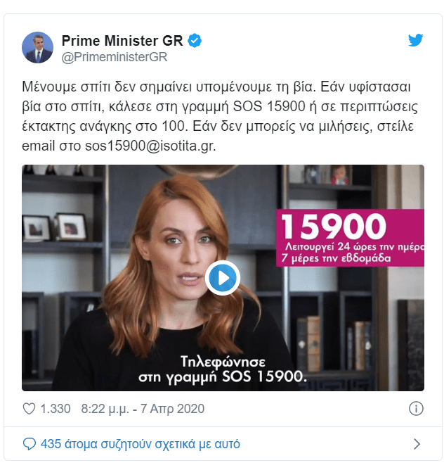 “Μένουμε σπίτι δεν σημαίνει υπομένουμε τη βία. Εάν υφίστασαι βία στο σπίτι, κάλεσε στη γραμμή SOS 15900 ή σε περιπτώσεις έκτακτης ανάγκης στο 100. Εάν δεν μπορείς να μιλήσεις, στείλε email στο sos15900@isotita.gr” αναφέρει σε μήνυμά του στο twitter ο Κυριάκος Μητσοτάκης αναφερόμενος στην αύξηση των κρουσμάτων κακοποίησης γυναικών λόγω της πανδημίας.