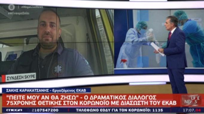 Στο Live News και τον Νίκο Ευαγγελάτο μίλησε με σύνδεση μέσω skype ο διασώστης του ΕΚΑΒ Σάκης Καρακατσάνης, ο οποίος εξομολογήθηκε τον συγκλονιστικό διάλογο που είχε μέσα στο ασθενοφόρο με μια γυναίκα που ήταν θετική στον κορονοϊό.