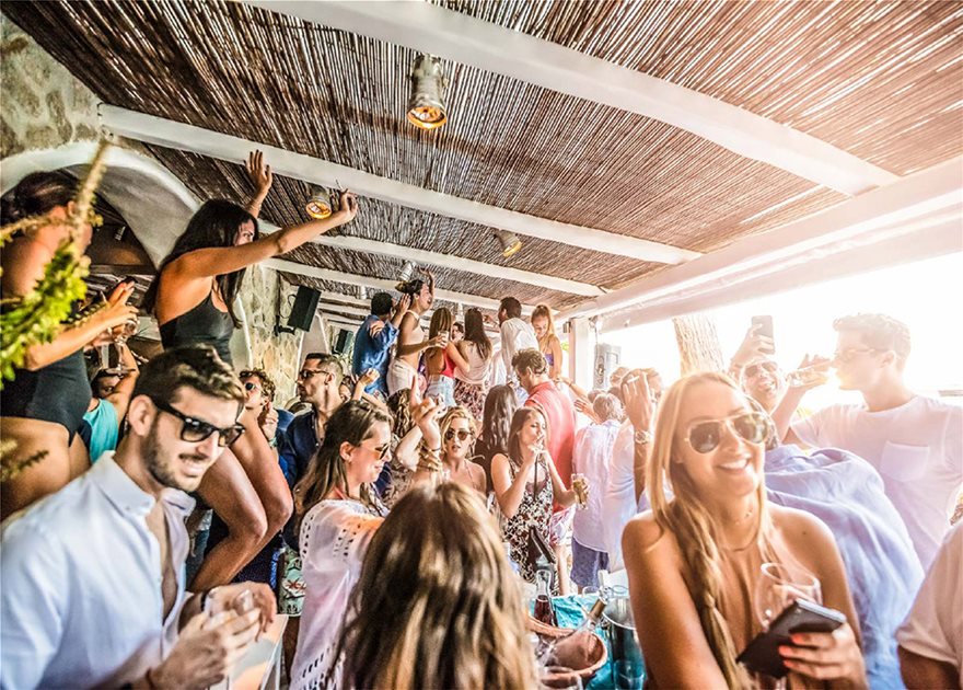 Η σκηνή θα μπορούσε να είναι αληθινή και να εκτυλίσσεται σε ένα από τα πιο διάσημα κλαμπ του κόσμου, αυτό που είναι καρφωμένο στην κορυφή ενός Μυκονιάτικου βράχου.