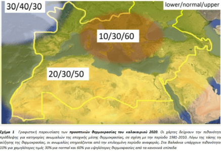 Συγκεκριμένα, στα Βαλκάνια την Ιταλία και την δυτική Τουρκία όπως φαίνεται στον παραπάνω χάρτη υπάρχουν μόνο 10% πιθανότητες για χαμηλότερες τιμές θερμοκρασίας, 30% για φυσιολογικές για την εποχή τιμές και 60% για υψηλότερες τιμές πάνω από τα κανονικά επίπεδα.