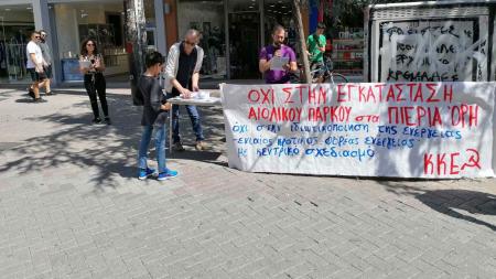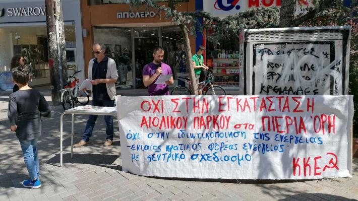 Μέλη της Τομεακής Οργάνωσης Πιερίας του ΚΚΕ και της ΚΝΕ πραγματοποίησαν εξόρμηση τo πρωί της Παρασκευής στον πεζόδρομο της Κατερίνης, στο πλαίσιο της Παγκόσμιας Μέρας για το Περιβάλλον, αναδεικνύοντας τις θέσεις του Κόμματος ενάντια στην εγκατάσταση αιολικού πάρκου στα Πιέρια Όρη, στη θέση «Πέντε Πύργοι».