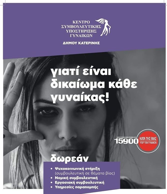 Οποιαδήποτε γυναίκα θέλει να επικοινωνήσει με το Κέντρο Συμβουλευτικής Υποστήριξης Γυναικών Δ. Κατερίνης μπορεί να επικοινωνεί στο τηλέφωνο 23510 366 78. E–mail: womenaid@katerini.gr . Ωράριο λειτουργίας: Από Δευτέρα έως Παρασκευή, από τις 7.30 π.μ. έως τις 3.30 μ.μ. 24ωρη τηλεφωνική γραμμή SOS 15900.