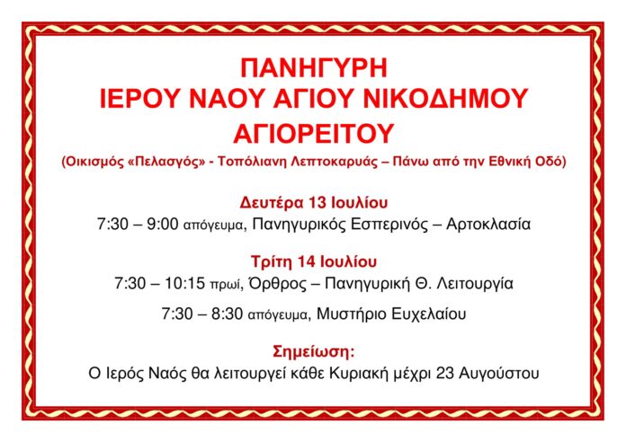 Πανήγυρις στον Ιερό Ναό Αγίου Νικοδήμου του Αγιορείτου στην περιοχή του Λιτοχώρου, στον Οικισμό Δασκάλων Ν. Λάρισας «Ο Πελασγός» Τοπόλιανη Λιτοχώρου – Πάνω από την Εθνική Οδό.