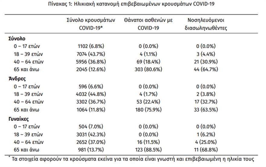 Τέλος, έχουμε 7 ακόμα καταγεγραμμένους θανάτους και 376 θανάτους συνολικά στη χώρα. 140 (37.2%) γυναίκες και οι υπόλοιποι άνδρες. Ο μέσος όρος ηλικίας των θανόντων συμπολιτών μας ήταν τα 78 έτη και το 96.8% είχε κάποιο υποκείμενο νόσημα ή/και ηλικία 70 ετών και άνω.
