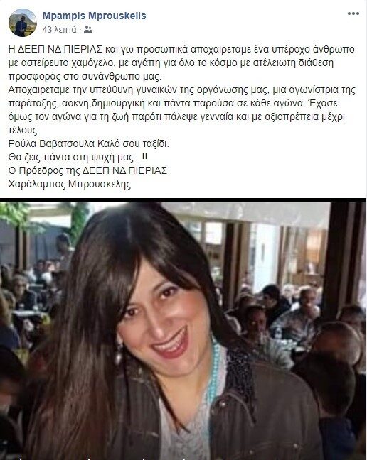 “Η ΔΕΕΠ ΝΔ ΠΙΕΡΙΑΣ και γω προσωπικά αποχαιρεταμε ένα υπέροχο άνθρωπο με αστείρευτο χαμόγελο, με αγάπη για όλο το κόσμο με ατέλειωτη διάθεση προσφοράς στο συνάνθρωπο μας.