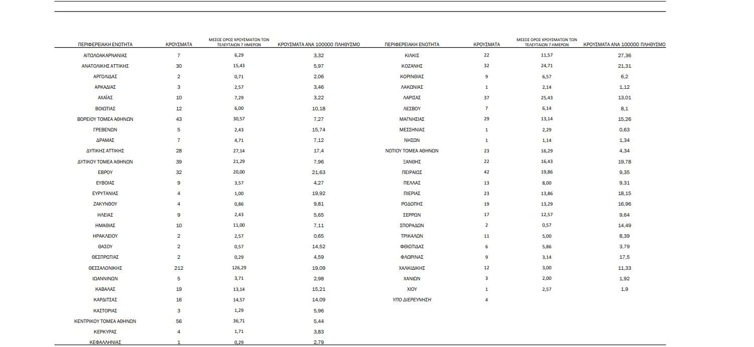 Αναλυτικά τα κρούσματα εντοπίζονται :