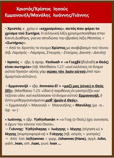 Συγκεκριμένα εξηγεί τι σημαίνουν τα ονόματα «Ιησούς» και «Χριστός», καθώς και τα «Εμμανουήλ» και «Ιωάννης» που γιορτάζουν κατά την περίοδο των γιορτών.